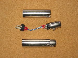 This is a 'barrel' style connector with one 3 pin XLR male at one end and a 3 pin XLR female at the other end. The top picture shows the components, the bottom picture shows the assembled connector. There is not enough length here to put a transformer in the barrel, but a pad will fit fine. Or you can drill a hole in the barrel and add a cable for a 'pigtail' like our xlr pigtail listed in the adapters section of the site.
